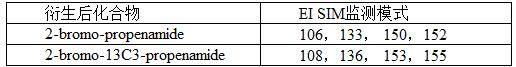 ⦁ 拓展標準,由于前處理采用衍生化方法,步驟繁瑣,引入誤差大,嘗試非衍生的前處理方法,GCMS采用NCI SIM監(jiān)測模式,監(jiān)測離子見下表: