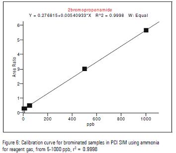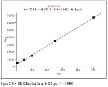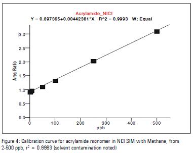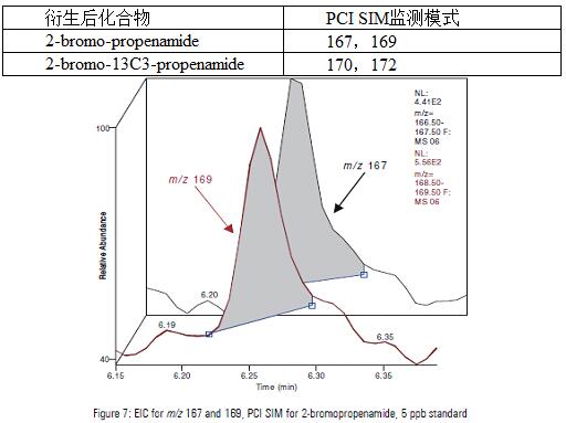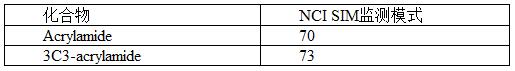 已經頒布的食品中丙烯酰胺的檢測范圍為10-50ppb, 而在PCI SIM模式下,方法檢出限為2ppb,線性范圍為5-1000ppb,如figure 6:
