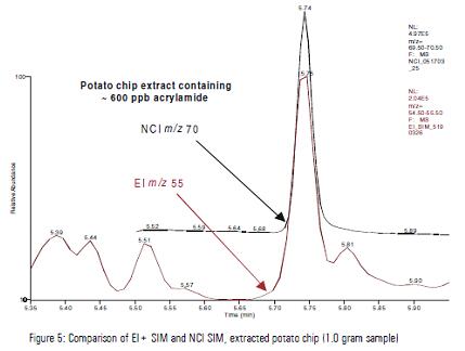 另外,由于CI源具有高度選擇性,可以降低基質干擾提高靈敏度,下圖為未衍生化的薯條樣品EI SIM和NCI SIM的譜圖比對,圖中可見,NCI模式下,基線噪音很低,化合物的響應很高,大大提高了靈敏度。