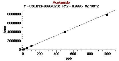 在所建立方法下,丙烯酰胺儀器檢出限為0.05ppb,線性范圍為:0.1ppb-1000ppb。分別如圖1、圖2所示: