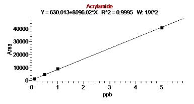 圖3:低濃度0.1-5ppb范圍放大圖(丙烯酰胺線性關系圖)