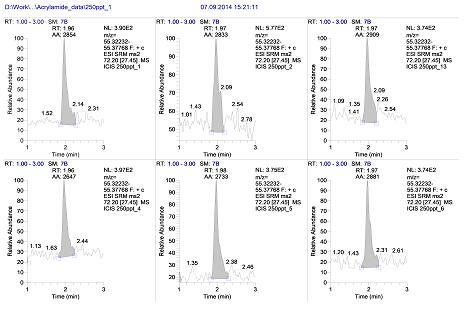 圖4:丙烯酰胺0.25ppb進樣6針重復性(3.5%)