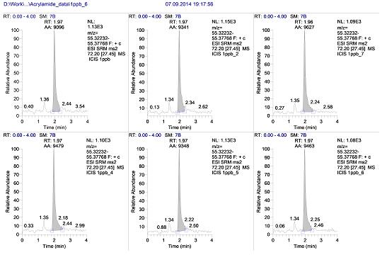 圖5:丙烯酰胺1ppb進樣6針重復性(1.9%)