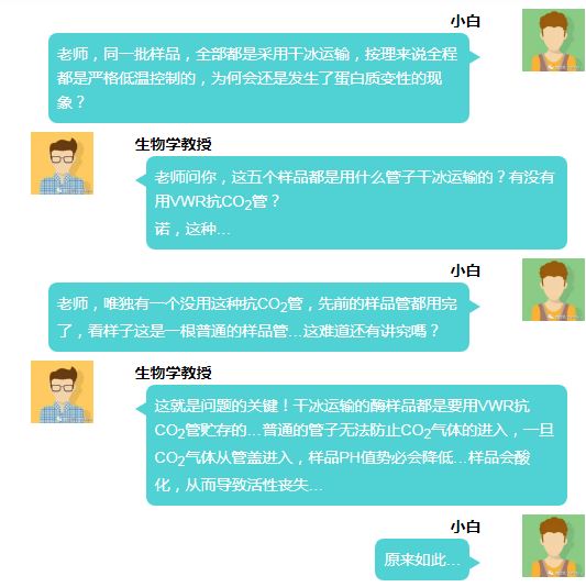在上述案例中,酶的樣品被酸化,導(dǎo)致蛋白質(zhì)變性…小白忽略了干冰升華為CO2后會對普通樣品管貯存的酶的樣品溶液產(chǎn)生影響…通常,即便是短期貯存,樣品也可能會受CO2影響而被酸化。這種酸化會影響樣品的完整性和復(fù)性,并可能導(dǎo)致其活性的喪失。這種情況就要使用特殊的抗CO2管來貯存樣品