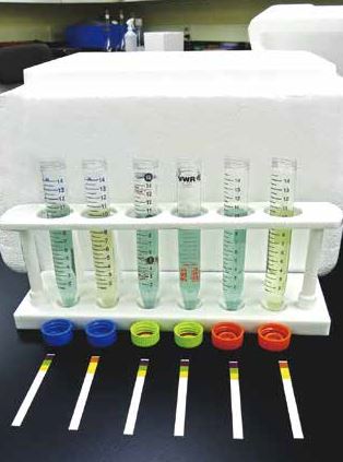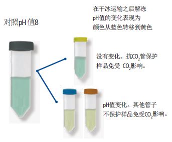 VWR抗CO2管能夠有效保護樣品不被酸化,其他的容器不能在干冰升華為CO2的過程保護樣品。碳酸的形成將導(dǎo)致pH值降低2.5pH單位。在這個實驗中, 酸化的表現(xiàn)是試劑顏色從藍(lán)色到黃色