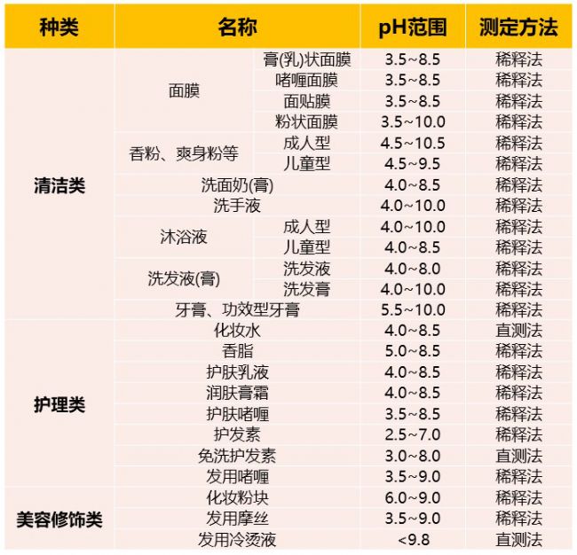 國家標準對化妝品的pH有著明確的規(guī)定,主要法規(guī)包括《化妝品通用檢驗方法 pH的測定》、《表面活性劑水溶液pH的測定 電位法》及各類化妝品產品標準中關于pH指標的規(guī)定等,以下是常見化妝品pH的規(guī)范表格: