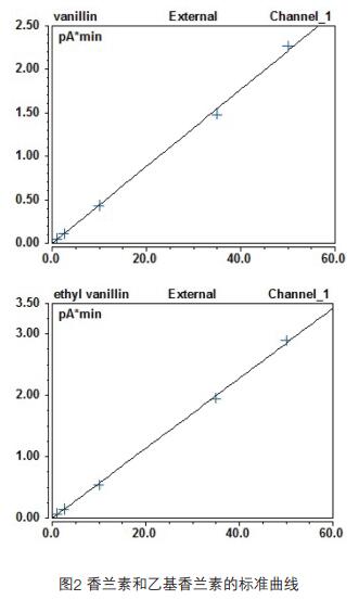 標(biāo)準樣品中香蘭素和乙基香蘭素的色譜圖如圖1所示。用標(biāo)準樣品配制成濃度分別為1 μg/mL, 2.5 μg/mL,10 μg/mL, 35 μg/mL, 50 μg/mL的系列標(biāo)準工作液,進樣1 μL,然后按照以上所述的測定方法進行GC-FID測定,以標(biāo)準物質(zhì)的濃度為橫坐標(biāo),以各標(biāo)準物質(zhì)的峰面積為縱坐標(biāo),繪制標(biāo)準曲線,得到香蘭素和乙基香蘭素的標(biāo)準工作曲線如圖2。香蘭素和乙基香蘭素的相關(guān)系數(shù)分別為0.9980和0.9991。