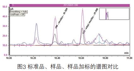 對香蘭素和乙基香蘭素的1 μg/mL, 2 μg/mL, 10 μg/mL三個水平加標(biāo)樣品分別進行了3次測定,平均回收率和相對標(biāo)準偏差列于表2中。樣品加標(biāo)的色譜圖見圖3。選擇1 μg/mL的標(biāo)準溶液,以噪聲的3倍計算,本方法中香蘭素和乙基香蘭素的檢測限分別為0.33 μg/mL和0.25 μg/mL。