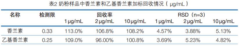 按上述前處理方法測定了4個奶粉樣品中的香蘭素和乙基香蘭素含量,其中樣品1為I段奶粉,為禁止添加香蘭素和乙基香蘭素。樣品2、 3、 4為III段奶粉,可以添加香蘭素和乙基香蘭素,允許添加量為5 mg/100 mL,即50 μg/mL。其中100 mL以即食食品計,即沖調(diào)好的奶液,按照奶粉沖調(diào)說明一般為每100 mL水加入14 g奶粉。樣品中的香蘭素和乙基香蘭素的含量采用外標(biāo)法定量,配制一系列標(biāo)準工作溶液,以濃度為橫坐標(biāo),峰面積為縱坐標(biāo)繪制標(biāo)準曲線,定量結(jié)果按公式(1)換算為奶液中的含量,列于表3中。