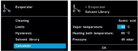 1)調(diào)用溶劑數(shù)據(jù)庫,里面有內(nèi)置好的蒸餾參數(shù)—某種溶劑在特定加熱鍋溫度下所對應(yīng)的真空值,直接蒸餾