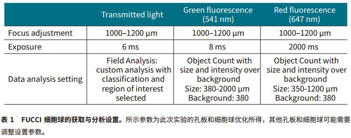 MiniMax 細(xì)胞計(jì)數(shù)儀的透射光模塊可以從自動(dòng)聚焦得到更好的圖像效果。SoftMax Pro 軟件中的“Field Analysis”能進(jìn)行自定義分析從而鑒別細(xì)胞重疊的部分。我們應(yīng)用一種特殊的鑒別方法來區(qū)分目標(biāo)球體和其余物體,如殘?jiān)蛡(gè)體細(xì)胞,從而在后續(xù)的分析中予以去除 (Figure 2, A and E)。最后,我們選擇感興趣的區(qū)域并從圖像中去除不想要的物體。在綠色和紅色熒光通道中,球體可以通過“Object Count”模式中大小和與背景相對(duì)熒光強(qiáng)度的區(qū)別被輕易的篩選出來 (Figure 2, B-D, F-G)。然后運(yùn)用SoftMax Pro 軟件計(jì)算圖像的“% Area coverage”和球體的“Object Area” (μm2)。圖像的獲取和分析的設(shè)置方法見表 1。