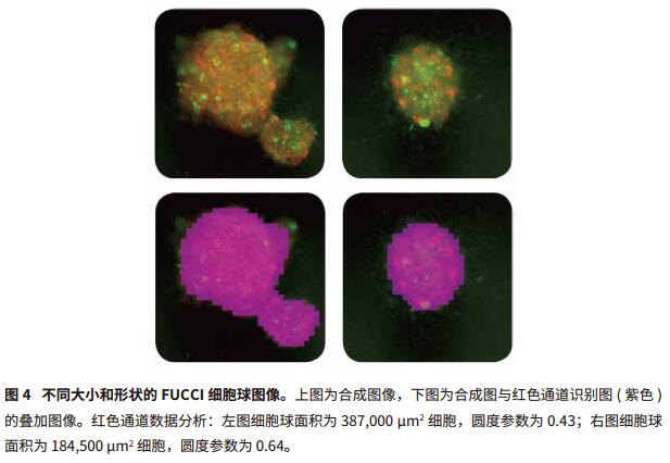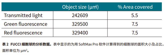 SoftMax Pro 軟件中獲取及分析的設(shè)置可以在綠色和紅色熒光通道的透射光下簡便快速地分辨每個(gè)孔中的單球體。SoftMax Pro軟件還可計(jì)算所有通道包含的面積占比和物體面積 (μm2) (圖 3,表 2)。在綠色和紅色熒光通道下可以獲得最好的結(jié)果。對(duì)于 FUCCI 球體來說,圖 3 中紅色部分展示的是光滑圓潤的球體而綠色部分則在細(xì)胞表面,說明球體內(nèi)部的細(xì)胞處在 G1 期而表面細(xì)胞即將進(jìn)入 M 期。對(duì)應(yīng)軟件可以分辨球體大小和形狀 ( 球形參數(shù) ) 的各種變化,因此常用來研究多種處理,如抗癌藥物,對(duì)細(xì)胞增殖的影響 ( 圖4 )。MiniMax 中綠色和紅色熒光的光學(xué)成形功能可以將 3D 圖像轉(zhuǎn)換為 2D 投射球體圖。