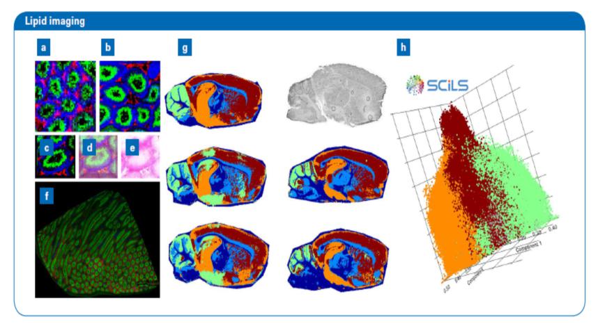 圖2:在不同的像素大。a-c,按比例顯示)對(duì)大鼠睪丸進(jìn)行的分析。在25μm(a)時(shí),組織結(jié)構(gòu)不能清晰地顯示,表明需要更高的分辨率。在10μm時(shí),可見(jiàn)清晰形態(tài)(b)。即使在最小的像素尺寸(5μm,c-e)下,組織完整性仍被完全保留。10μm像素大小下,獲取一個(gè)大型檢測(cè)結(jié)果(0.4 cm2, 394,629像素)僅耗時(shí)137分鐘(48像素/秒),顯示了高度穩(wěn)定的數(shù)據(jù)質(zhì)量(f)。五只小鼠腦切片(總像素594,434)測(cè)量用時(shí)約4小時(shí)(43像素/秒),導(dǎo)入常規(guī)臺(tái)式PC利用SCiLS Lab 2015b分析和可視化用時(shí)約2小時(shí)。這里展示的是分割圖(g)以及所有圖譜的主成分分析結(jié)果,顯示皮質(zhì)、海馬體和小腦組織的分離(h)。