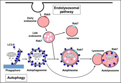 大自噬(macroautophagy),也就是通常說的自噬(autophagy),是真核細(xì)胞蛋白降解的途徑之一。自噬可以被描述為細(xì)胞質(zhì)內(nèi)的成分(細(xì)胞器、蛋白等)被雙層膜的囊泡包裹,形成自噬體(autophagosome),進(jìn)而傳遞到溶酶體進(jìn)行降解的過程。詳細(xì)來說,自噬過程與內(nèi)涵體途徑(endolysosomal pathway)密不可分(見圖1)。一方面,自噬體能夠與晚期內(nèi)體(late endosome)融合形成中間囊泡(amphisome)最終形成自噬溶酶體(autolysosome);另一方面,自噬體能夠直接與溶酶體(lysosome)融合形成自噬溶酶體。無論通過哪條途徑,自噬溶酶體最終通過酸性水解酶將細(xì)胞器、蛋白等消化分解。