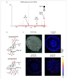 圖2. 人參根橫切片中Rf和Rg1的DESI-MS/MS成像結(jié)果3。a)Rf/Rg1(m/z 799.52)的MS/MS譜圖。b)Rf和Rg1的分子結(jié)構(gòu)。c)Rf和Rg1的DESI-MS/MS成像圖。