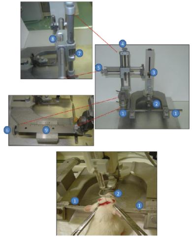 圖1:腦立體定位儀。(1)耳棒;(2)齒棒;(3)注射器支架;(4)設(shè)置垂直坐標(biāo)的螺釘;(5)設(shè)置橫向