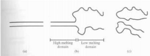 DNA 雙鏈分子在全長不斷增加溫度或用化學變性劑條件處理下,兩條鏈就會開始分開(即解鏈)。首先解鏈的區(qū)域由解鏈溫度較低的堿基組成。GC堿基對比AT堿基對結(jié)合得要牢固,因此GC含量高的區(qū)域具有較高的解鏈溫度。同時影響解鏈溫度的因素還有相鄰堿基間的吸引力。解鏈溫度低的區(qū)域,通常位于端部稱作低溫解鏈區(qū)。如果端部分開,那么雙螺旋就由未解鏈部分束在一起,這一區(qū)域便稱作高溫解鏈 (圖1) 。