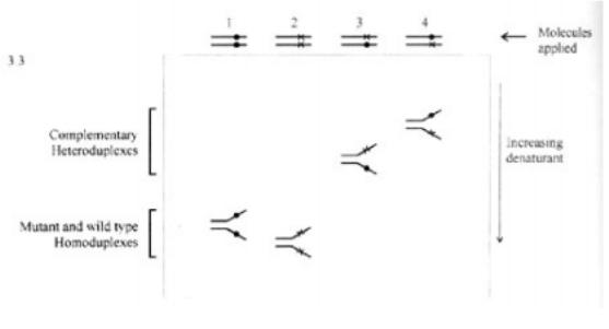 最終,如果一雙鏈在其低溫解鏈區(qū)堿基錯配(異源雙鏈),而與另一等同的雙鏈相比差別僅在于此,那么,含有錯配堿基的雙鏈將在低得多的變性劑濃度下解鏈。事實上,樣品通常含有突變、正常的同源雙鏈以及配對的異源雙鏈,后者是在PCR擴增加時產(chǎn)行的。而含有錯配的雙鏈(圖2中的3和4道)通?梢赃h遠地與兩個同源雙鏈(圖2中1和2道)分開,這種分離效果使該方法靈敏度很高。為使僅有一個堿基之差的不同分子取得最好的分離效果,必須先選擇所要研究的DNA范圍以及電泳樣品時變性劑濃度梯度。這可以按圖 2 所示的正交變性梯度實驗進行經(jīng)驗性地解決。變性劑梯度應(yīng)選在曲線斜率大的部分,因為這時多數(shù)分子處于部分變性狀態(tài)這使得落入低溫解鏈區(qū)的不同分子達到最佳分離。