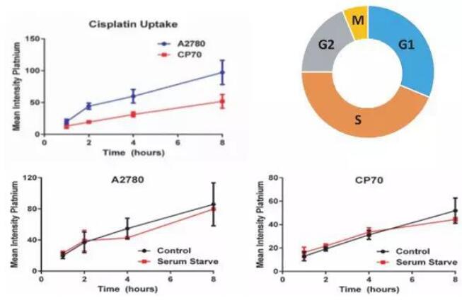 通過(guò)對(duì)兩株卵巢癌細(xì)胞系A2780(順鉑敏感型)和A2780/CP70(順鉑耐藥型)順鉑攝入量的實(shí)時(shí)檢測(cè)發(fā)現(xiàn):相比A2780 敏感細(xì)胞系,順鉑攝入在耐藥性的A2780/CP70 細(xì)胞系上水平降低;但順鉑攝入的細(xì)胞差異性不是由于細(xì)胞周期的不同,因?yàn)檠屦囸I細(xì)胞并不改變順鉑的整體攝入。順鉑攝入的胞內(nèi)差異性是由于其他尚未確定的因素造成的。