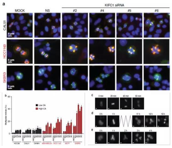 免疫熒光標(biāo)記Aurora A(綠色)和雙極有絲分裂驅(qū)動(dòng)蛋白Eg5(紅色),Hoechst標(biāo)記細(xì)胞核(藍(lán)色),通過(guò)Operetta高內(nèi)涵成像獲取高分辨率圖像及Hamony軟件進(jìn)行多極性有絲分裂分析打分,發(fā)現(xiàn)在3株中心粒高擴(kuò)增的細(xì)胞系和4株中心粒低擴(kuò)增細(xì)胞系中,KIFC1沉默都能顯著提高單個(gè)細(xì)胞的紡錘體數(shù)量,造成有絲分裂多極性(下圖a-b)。并且通過(guò)在MDA-MB-231細(xì)胞株上的實(shí)時(shí)動(dòng)態(tài)檢測(cè)進(jìn)一步驗(yàn)證了KIFC1沉默對(duì)有絲分裂多極性的影響(下圖c)。