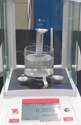 測試時,通過在空氣中和水中先后稱量玻璃樣品質(zhì)量,從而求得其密度值。值得注意的是,由于溫度對液體的密度有很大的影響,這會直接影響到稱量結(jié)果小數(shù)點后第三位的準確性。因此,測試前需要使用精密溫度計測試實際水溫。另外,在稱量時,應(yīng)及時擦拭附著水滴, 如:燒杯上,下沉固體掛籃和鑷子,以免增加重量,引起稱量的不準確。