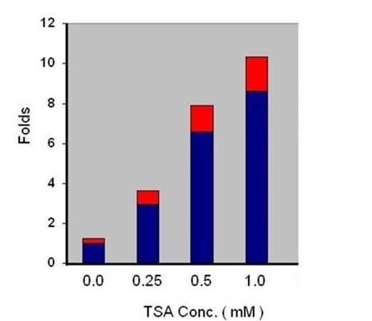 實(shí)例1:分析用不同濃度的TSA處理12小時(shí)的細(xì)胞中的總乙酰化蛋白水平。即先用抗AcK瓊脂糖填料(ICP038)富集IP,再以ELISA方法用HRP標(biāo)記的抗乙酰化抗體(ICP0381)做檢測(cè)不同濃度TSA處理的細(xì)胞中,快速檢測(cè)出其蛋白質(zhì)乙酰化增加達(dá)10倍。