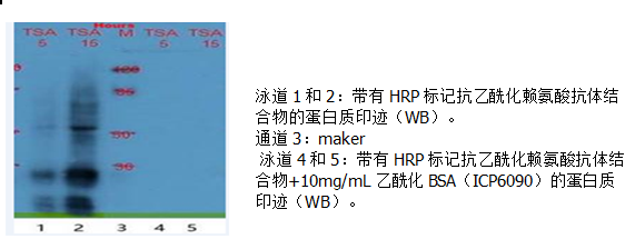 實(shí)例2:分別用HDAC抑制劑TSA處理5和15小時(shí)后,對(duì)MMRU細(xì)胞樣品中的乙;鞍踪|(zhì)進(jìn)行Western blot分析。即樣品先用抗乙;嚢彼岘傊翘盍希↖CP0388)親和富集(IP),再用WB方法,加入HRP標(biāo)記的抗乙;贵w(ICP0381)進(jìn)行檢測(cè),快速得到高確定性的WB結(jié)果。