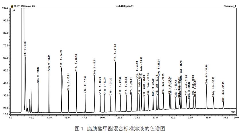 標(biāo)準(zhǔn)樣品中 37 種脂肪酸甲酯的色譜圖如圖 1 所示。 37 種The world leader in serving science 脂肪酸甲酯的保留時(shí)間和名稱列于表 1 中用標(biāo)準(zhǔn)樣品配制成總濃度分別為 20 μg/mL, 40 μg/mL, 100 μg/mL, 200 μg/mL, 400 μg/ml 的系列標(biāo)準(zhǔn)工作液, 進(jìn)樣 1μL, 然后按照以上所述的測(cè)定方法進(jìn)行 GC-FID 測(cè)定, 以標(biāo)準(zhǔn)物質(zhì)的濃度為橫坐標(biāo), 以各標(biāo)準(zhǔn)物質(zhì)的峰面積為縱坐標(biāo),繪制標(biāo)準(zhǔn)曲線, 得到各種脂肪酸甲酯的線性相關(guān)系數(shù)列于表 1 中。 檢測(cè)限以 3 倍信噪比計(jì)算, 結(jié)果列于表 1 中。