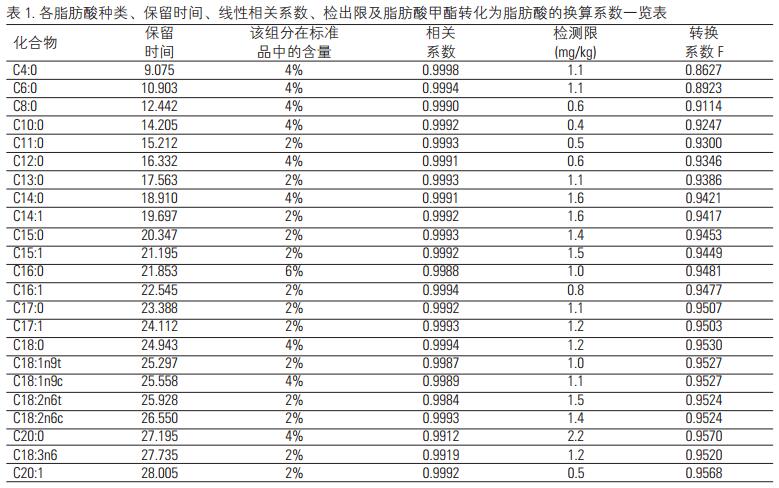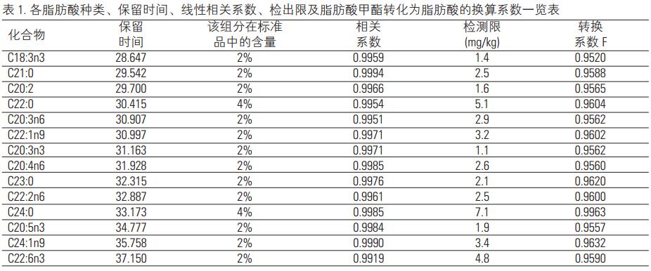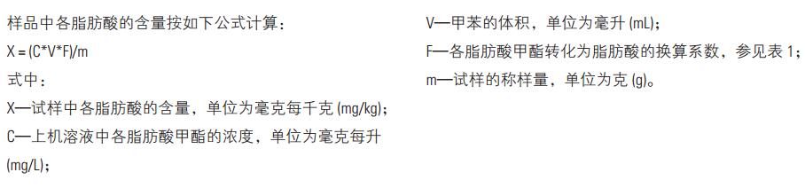 嬰兒體格、 智力和行為的發(fā)育除了受先天因素和早期教育的影響外, 還與后天的營養(yǎng)狀況有很大關(guān)系。 日本營養(yǎng)學(xué)專家飯野節(jié)夫的研究結(jié)果表明, 兒童的腦力發(fā)展 80%以上取決于營養(yǎng)。 而在眾多營養(yǎng)素中, 脂肪酸與智力發(fā)育有密切關(guān)系是受到學(xué)術(shù)界肯定的。 中國農(nóng)業(yè)大學(xué)食品學(xué)院營養(yǎng)與食品安全系系主任何計(jì)國副教授說:“在注意膳食脂肪合理攝入量的同時(shí), 必須考慮各種脂肪酸的搭配。 適宜比例的脂肪酸攝入, 能降低患肥胖、 心血管疾病的危險(xiǎn)性, 并促進(jìn)胎兒、 嬰幼兒大腦和視覺的發(fā)育!币虼, 嬰幼兒食品中脂肪酸的組成引起人們的重視, 衛(wèi)生部于 2010 年發(fā)布食品安全國家標(biāo)準(zhǔn)《GB 5413.27-2010 嬰幼兒食品和乳品中脂肪酸的測(cè)定》[1], 規(guī)定了脂肪酸的檢測(cè)方法, 本方法依據(jù)該標(biāo)準(zhǔn)方法中第一法用氣相色譜法對(duì)嬰幼兒食品和乳品中的脂肪酸進(jìn)行了測(cè)定。