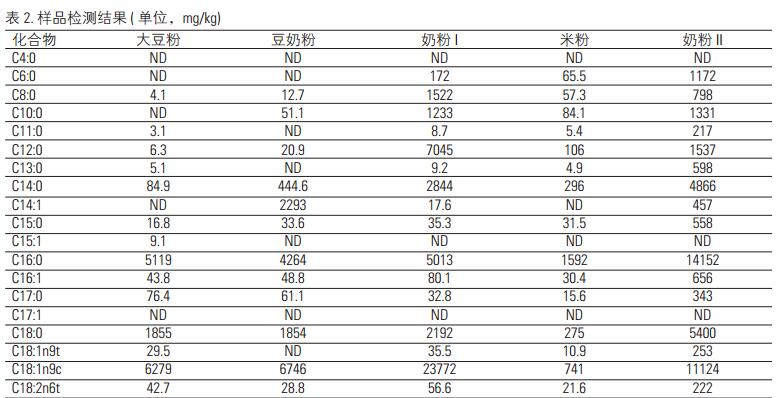 采用本方法測(cè)定了大豆粉、 豆奶粉、 奶粉 I、 米粉、 奶粉II 五種樣品中的脂肪酸含量, 測(cè)定譜圖見圖 2, 各檢測(cè)結(jié)果列于表 2 中。
