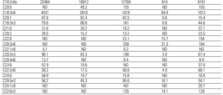 C22:6ns 是二十二碳六烯酸 (Docosahexaenoic Acid, DHA),C20:5 是二十碳五烯酸 (EicosaPentaenoic acid, EPA), C20:4n6是花生四烯酸(Arachidonic acid, ARA)。 研究表明 DHA 有益于嬰兒的大腦和眼睛。 DHA 在視神經(jīng)細(xì)胞及視網(wǎng)膜組織中的含量高達(dá) 40%-47%, 如果食物中缺乏 DHA, 可使視網(wǎng)膜組織中 DHA 含量下降, 從而導(dǎo)致視力下降。 大部分嬰兒配方奶粉中會(huì)添加這三種脂肪酸, 研究表明這三種脂肪酸對(duì)嬰兒智力和視力發(fā)育起到關(guān)鍵作用。 本文測(cè)定結(jié)果表明嬰幼兒配方奶粉中這三種脂肪酸的含量明顯高于其它食品。、