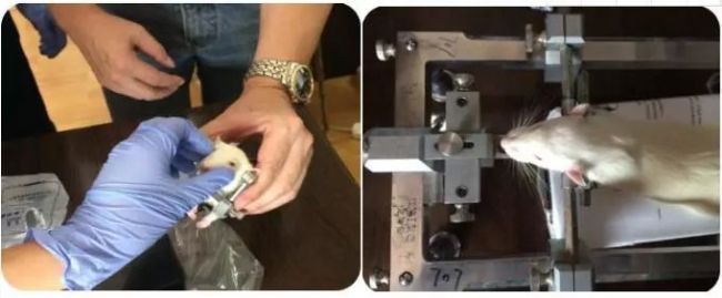1. 動(dòng)物麻醉后,通過(guò)耳桿和上齒固定板固定于立體定位儀上 。