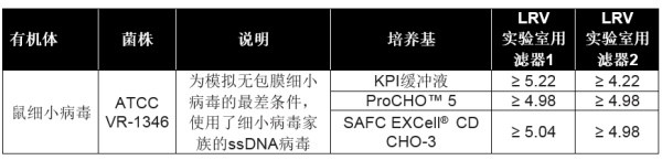 表1:新型除病毒培養(yǎng)基濾器的截留能力,實驗室用濾器(5 cm2)。