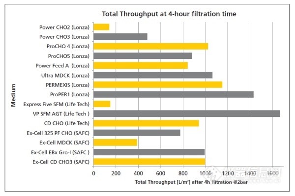 膜的通過量采用了三個不同供應商的15種培養(yǎng)基來測定。圖2表明了在2bar壓力下,4小時的培養(yǎng)基處理載量因培養(yǎng)基組分不同而差別很大。例如,Lonza Power CHO2相對較快地造成了膜堵塞,而Lonza ProPER1培養(yǎng)基似乎完全不堵膜。