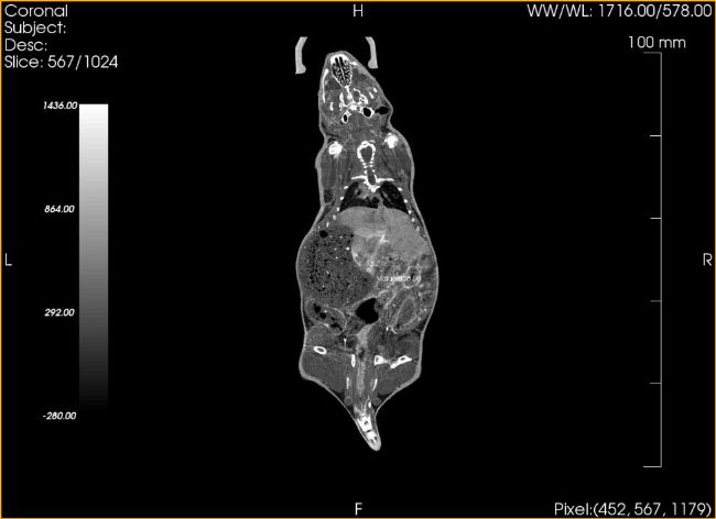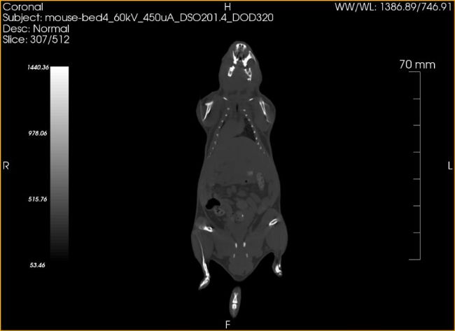 CBCT的一局限性是密度分辨率不夠,對(duì)部分軟組織解剖結(jié)構(gòu)特別是軟組織病變顯像不如螺旋CT清晰。所以,在Micro CT的小動(dòng)物實(shí)驗(yàn)上,一般會(huì)使用造影劑來(lái)增加內(nèi)臟的對(duì)比度。