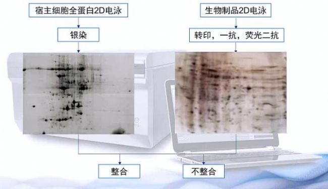 首先采用2D 雙向電泳技術高校分離HCP,一塊膠跑宿主細胞全蛋白2D電泳,之后染色使用sapphire儀器進行掃描成像,另一塊膠跑生物制品的2D電泳,然后將膠上蛋白轉移至膜上,經(jīng)過封閉,一抗,熒光二抗雜交,使用sapphire進行western blot熒光信號采集,通過結合2D 電泳和wesern blot結果比對鑒定,相比傳統(tǒng)的單獨的ELISA和WB方法,2D 電泳和WB技術能夠更為全面精準的鑒定微量的HCP