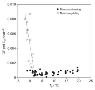 上左圖為不同個(gè)體(體溫順應(yīng)個(gè)體thermoconforming individuals,體溫調(diào)節(jié)個(gè)體thermoregulating individuals)心率和耗氧率的關(guān)系;上右圖顯示了不同個(gè)體(體溫順應(yīng)個(gè)體thermoconforming individuals,體溫調(diào)節(jié)個(gè)體thermoregulating individuals)在不同環(huán)境溫度(Ta)下的單位心率耗氧率(The transport of oxygen per heart beat (OP))的差異。