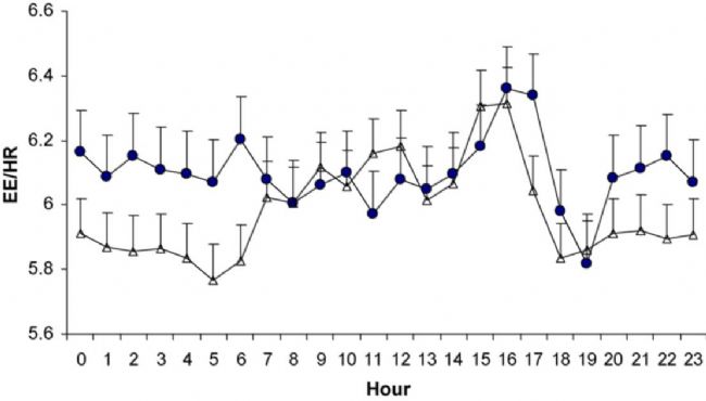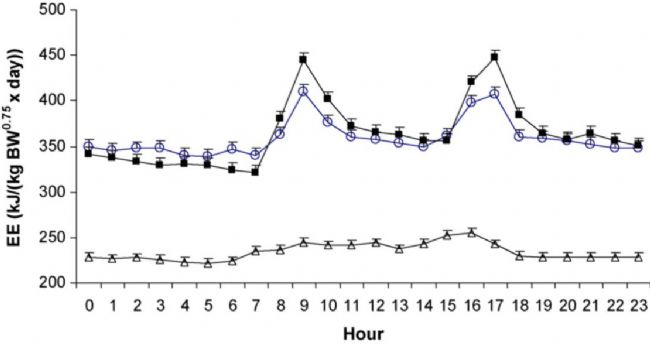 上圖顯示不同喂食處理(○為精飼料,■為草料,△為禁食)的山羊24小時(shí)時(shí)段內(nèi)能量消耗情況(EE,kJ/(kg BW0.75 ×day)