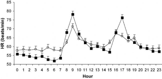 上圖顯示不同喂食處理(○為精飼料,■為草料)的山羊24小時(shí)時(shí)段內(nèi)心率變化情況Heart rate (beats/min)