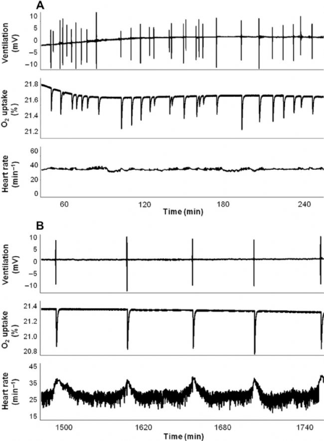 心肺相互作用是指動(dòng)物心血管功能和呼吸功能間復(fù)雜的相互影響和作用,一般認(rèn)為該作用受迷走神經(jīng)系統(tǒng)、副交感神經(jīng)系統(tǒng)和激素的調(diào)節(jié),作用關(guān)系微妙且復(fù)雜,研究心肺作用最直觀的觀測方法莫過于觀測動(dòng)物的心率和呼吸速率/能量代謝的變化關(guān)系。