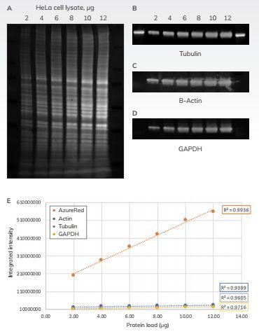 單色通道圖像A)AureRed染色總蛋白B)Tubulin C)β-action和D)GAPDH。 AzureRed信號的優(yōu)異動態(tài)范圍與實際加載的蛋白量顯示在圖像(A)中。使用AzureSpot軟件定量來自總蛋白和看家蛋白的信號,并將得到的值相對于每個樣品加載的蛋白量(E)作圖。與常見的看家蛋白相比,AzureRed表現(xiàn)出更強的相關(guān)性和更廣泛的動態(tài)范圍。