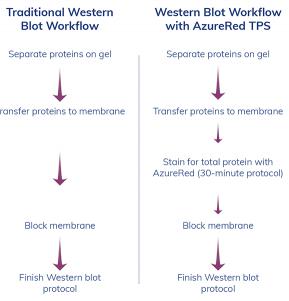 總蛋白標準化比使用看家蛋白質(zhì)快得多,特別是對于化學發(fā)光印跡,因為相對于剝離和重孵育染色步驟花費較少的時間。 理想情況下,在免疫檢測之前或之后,在膜上進行總蛋白染色。使用一些染色劑如AzureRed Fluorescent Total Protein Stain,可以在免疫檢測前對印跡進行染色,然后與目的蛋白同時對總蛋白進行成像(S)。 通過這種最簡單的工作流程,目的蛋白和總蛋白的圖像會自動對齊。
