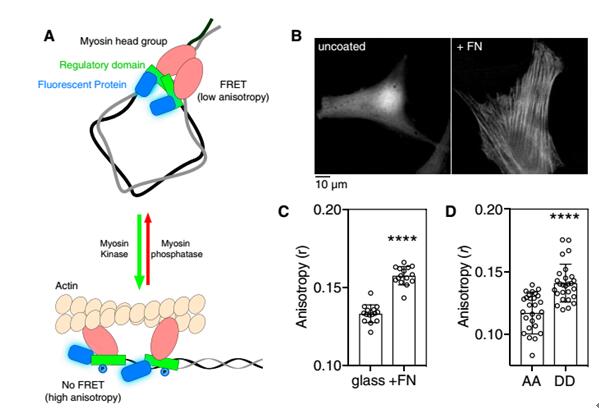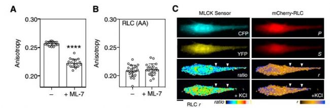 如圖1A所示,磷酸化導(dǎo)致RLC二聚體的解離,減弱FRET,異向性增加。將融合有熒光蛋白的RLC轉(zhuǎn)染至成纖維細(xì)胞分別培養(yǎng)在玻璃皿及鍍有纖連蛋白的玻璃皿中,發(fā)現(xiàn)鍍有纖連蛋白的實(shí)驗(yàn)組異向性顯著升高。并且RLC突變體AA(缺少磷酸化位點(diǎn))實(shí)驗(yàn)組的異向性明顯降低。