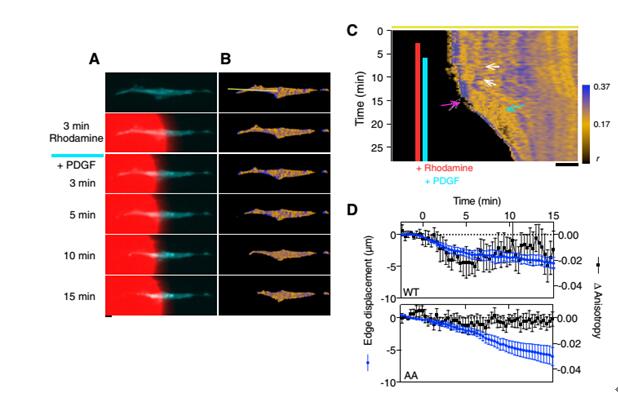 接下來(lái),研究人員需要進(jìn)行單細(xì)胞刺激以觀察亞細(xì)胞水平的肌球蛋白磷酸化動(dòng)態(tài)過(guò)程。在細(xì)胞收縮前,細(xì)胞外突出包含穩(wěn)定的高異向性磷酸化區(qū)域(圖3B),之后使用Biopen對(duì)細(xì)胞外突出進(jìn)行PDGF刺激,瑞典Fluicell公司的單細(xì)胞微流控給藥系統(tǒng)Biopen采用高端的微流控技術(shù),可以在顯微鏡下精確的控制液體覆蓋范圍,如圖中若丹明紅色染料所覆蓋區(qū)域即為本次實(shí)驗(yàn)的刺激區(qū)域。首先,細(xì)胞骨架收縮10-20μm(圖3C,白色箭頭),收縮前端的RLC異向性的提高(圖3C,粉色箭頭前方),肌球蛋白的去磷酸化,包括收縮前端(圖4C,粉色箭頭下方)和內(nèi)部(圖3C,藍(lán)色箭頭)。整個(gè)過(guò)程收縮邊緣肌球蛋白R(shí)LC的異向性改變定量統(tǒng)計(jì)見(jiàn)圖3D,mCer3-RLC(AA)邊緣的異向性無(wú)明顯改變,野生型的RLC異向性明顯降低。