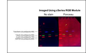 Azure Fluorescent Blot Blocking Buffer封閉兩半印跡膜,并使用如圖中標(biāo)記的四種不同熒光探針檢測(cè)四種蛋白。使用Azure cSeries RGB模塊對(duì)印跡進(jìn)行成像, 盡管徹底脫色,但在用麗春紅染色的一半印跡上看到非常高的熒光背景。