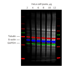 向凝膠中加入稀釋的HeLa細(xì)胞裂解物。轉(zhuǎn)印后,將印跡用AzureRed染色,然后在不脫色情況下加入tubulin,ß-actin和GAPDH探針。用Sapphire 雙模式多光譜激光成像系統(tǒng)掃描成像。四個(gè)通道進(jìn)行疊加,總蛋白質(zhì)(AzureRed染色)以灰色顯示;tubulin-紅色,ß-actin-藍(lán)色和GAPDH-綠色