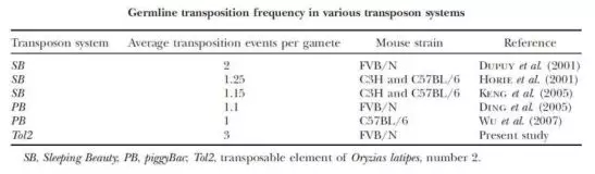 不同品系小鼠中,同一轉(zhuǎn)座子的轉(zhuǎn)座效率存在差異,相同品系小鼠中,Tol2較SB、PB在生殖細(xì)胞中的轉(zhuǎn)座效率更高[4],如表1。