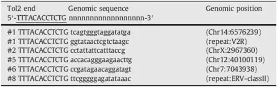 相較于PB、SB,Tol2轉(zhuǎn)座子靶點(diǎn)的選擇性更高,沒有明顯的位點(diǎn)特異性(8-bp的雜合堿基序列),在染色體上比較傾向整合于基因的5'端區(qū)域[3],如表2。