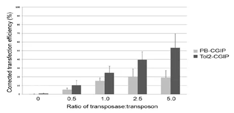 如下表4所示,隨著轉(zhuǎn)座酶與轉(zhuǎn)座子的比例增大,PB轉(zhuǎn)座效率逐漸飽和甚至出現(xiàn)下降趨勢(shì),表明過量表達(dá)的轉(zhuǎn)座酶會(huì)抑制PB的轉(zhuǎn)座反應(yīng),即過度抑制效應(yīng),但Tol2較之轉(zhuǎn)座效率不受影響, 沒有出現(xiàn)抑制效應(yīng)[6]。