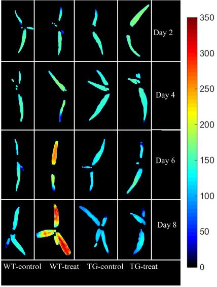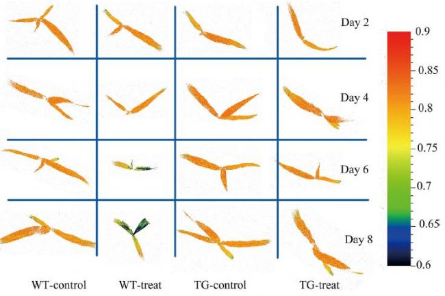 高光譜圖像隨草甘膦處理時間不同呈現(xiàn)不同變化,草甘膦處理早期TG和WT之間沒有明顯的形態(tài)變化(RGB成像),然而,對于高光譜成像,WT和TG植物之間的差異是顯而易見的,從藍(lán)色到紅色顯示草甘膦脅迫程度逐漸增加。